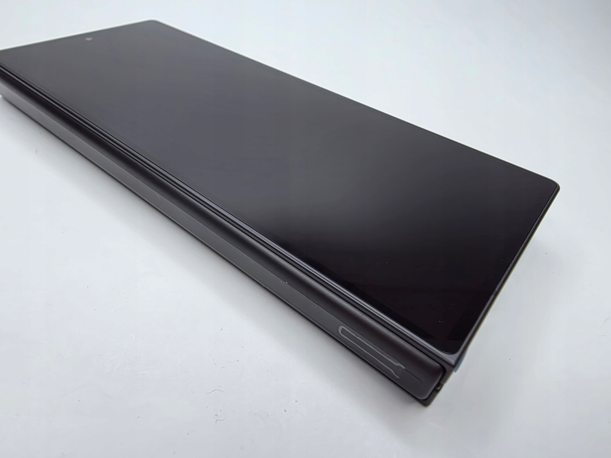 Na przednim ekranie małe mikroryski , małe obtarcia na kółkach od aparatu. Na korpusie jeszcze nie ściągnięte oryginalne folie.